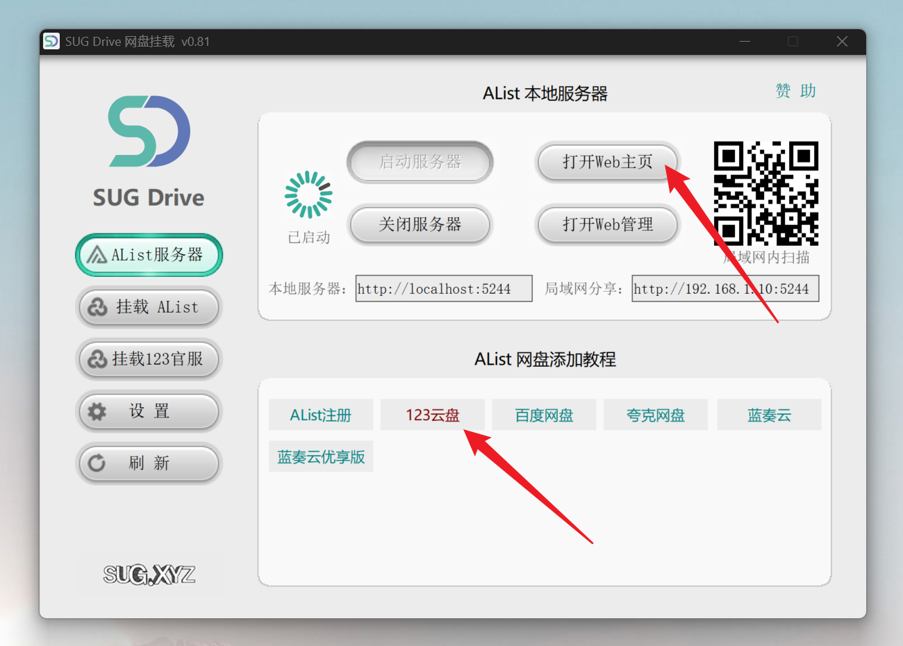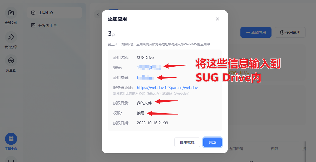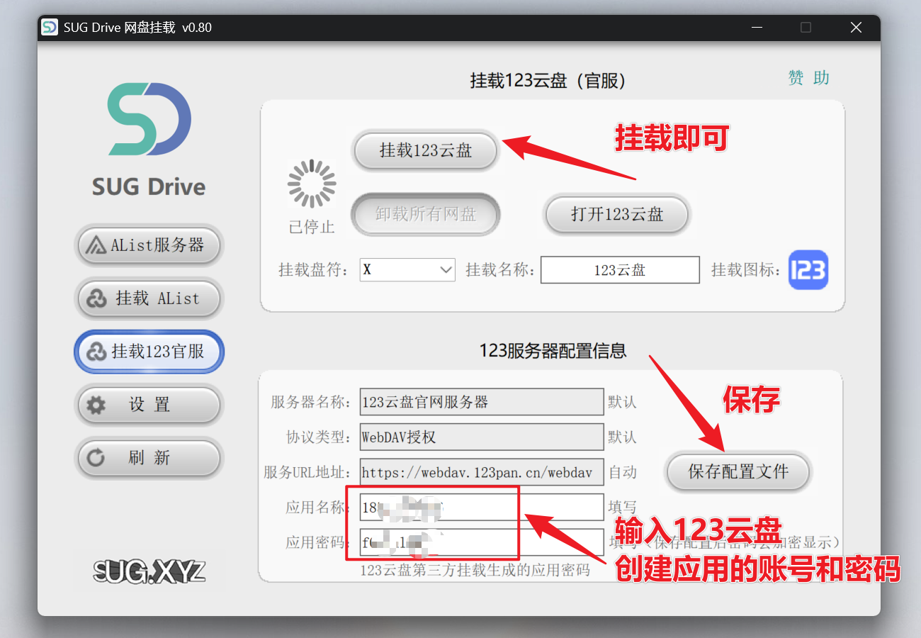 如果不行,就使用123云盘官方--工具中心--WebDAV授权管理,添加应用的方式在SUGDrive直接挂载,或者添加到AList 存储里。