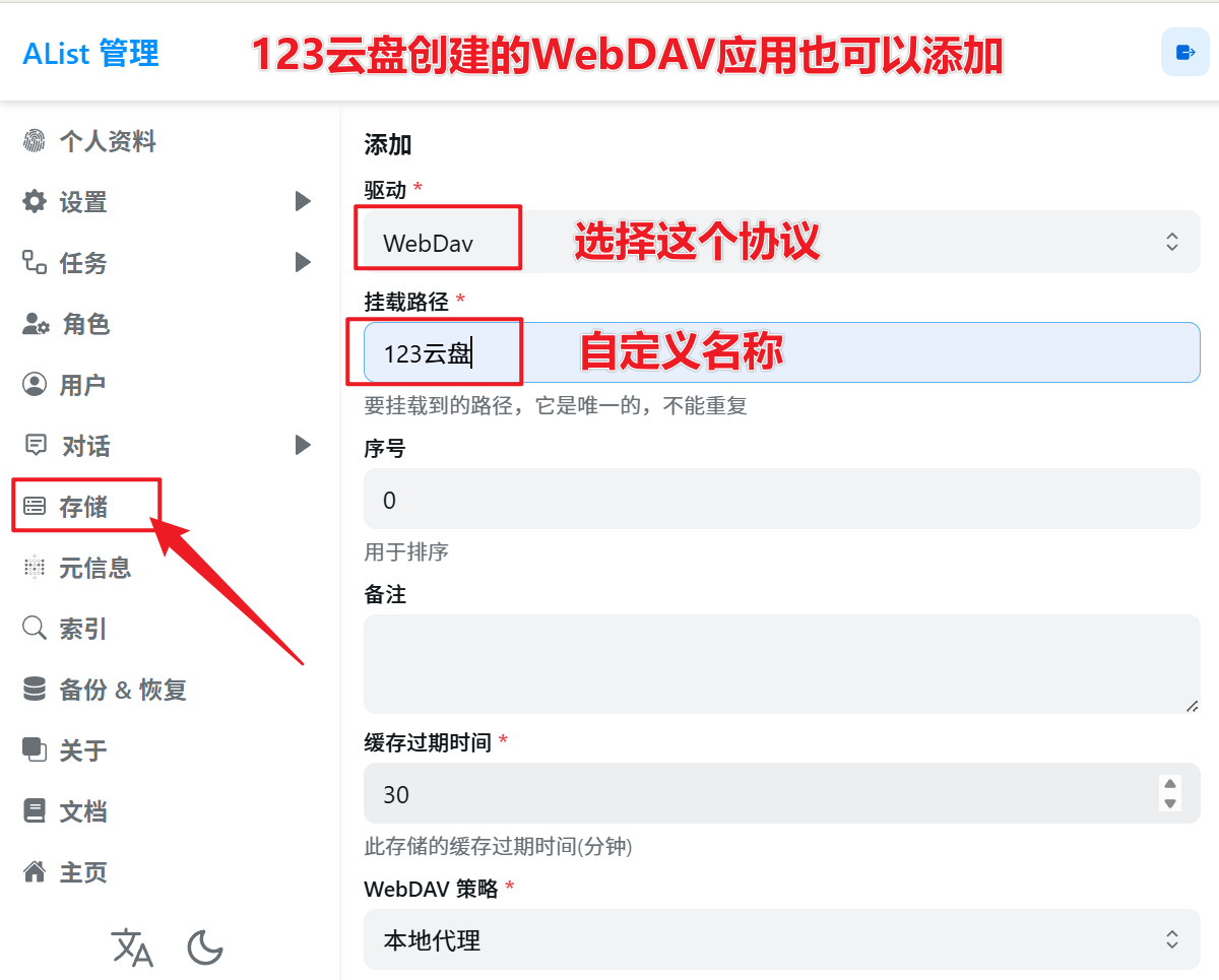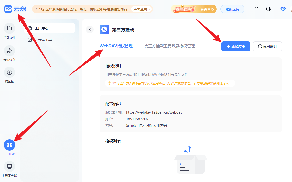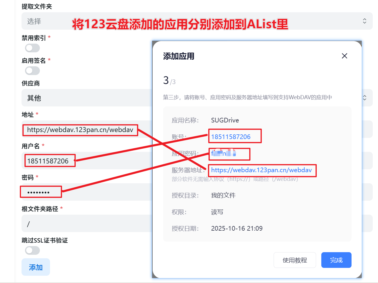 123云盘创建WebDAV应用的账号和密码,也可以给AList存储添加
