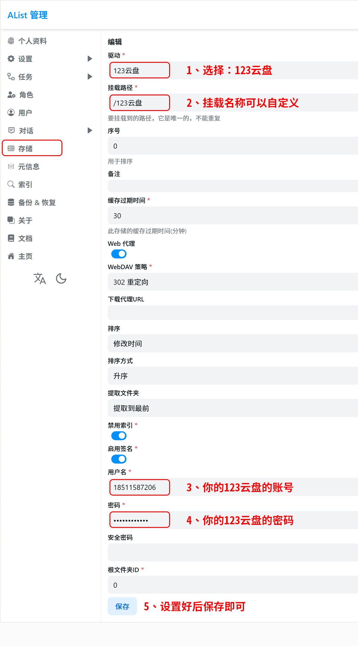 123云盘添加非常简单,只要填写名称、账号和密码,就OK了。