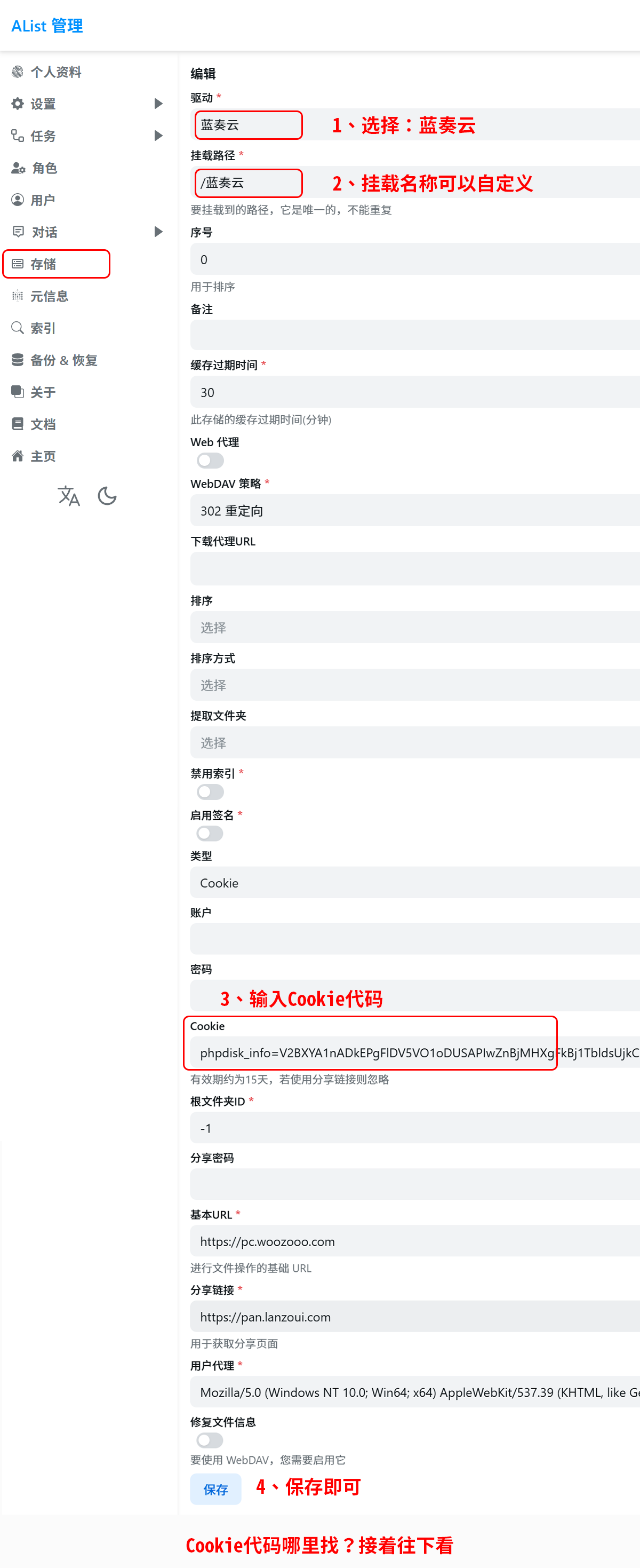 将这个复制到AList管理的Cookie 信息,保存就OK了。