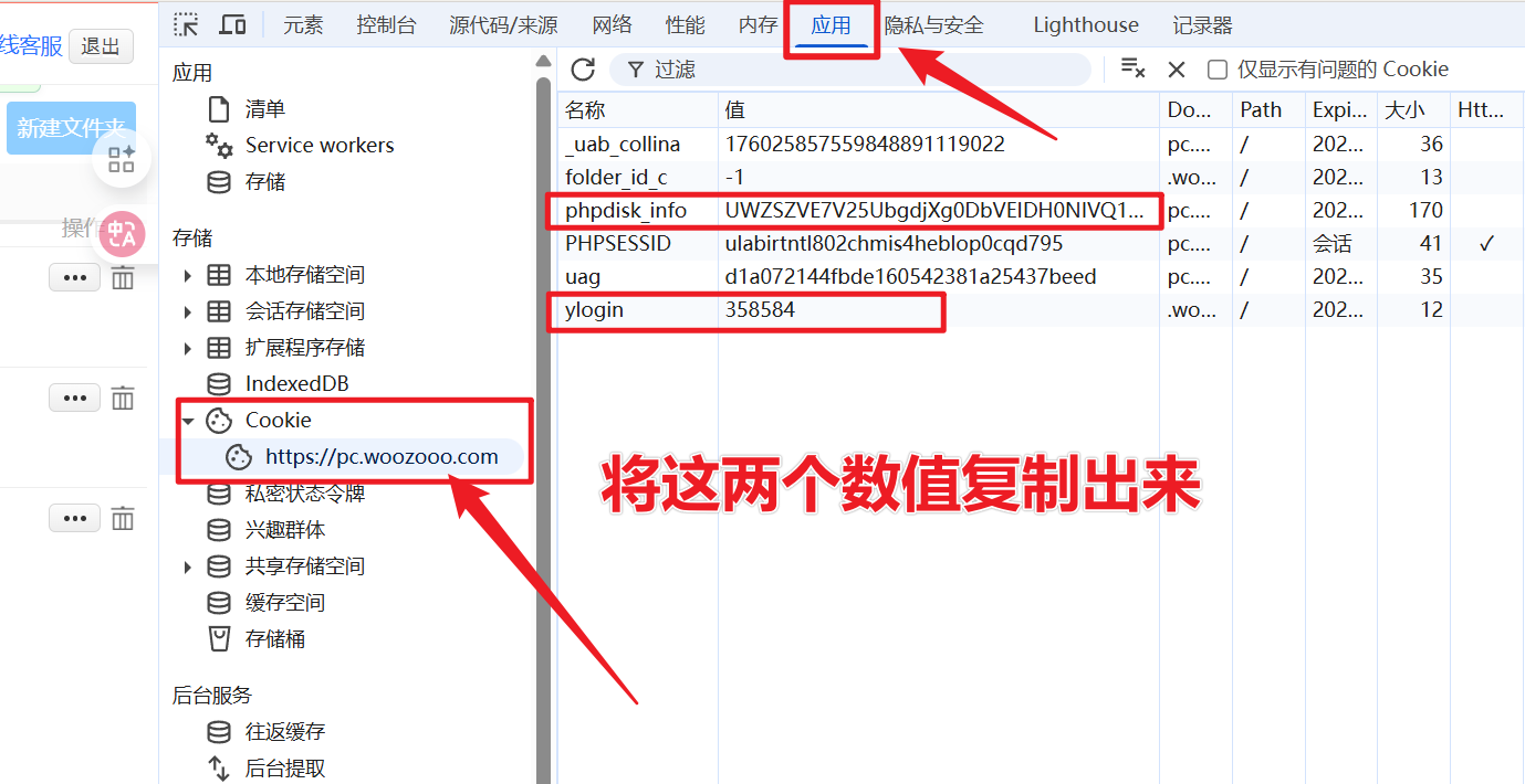 然后使用以上两组数值组成可用的 Cookie 信息,最长的放到phpdisk_info=后,数字分别放ylogin=;和 uid=后,用分号分开,如下:
