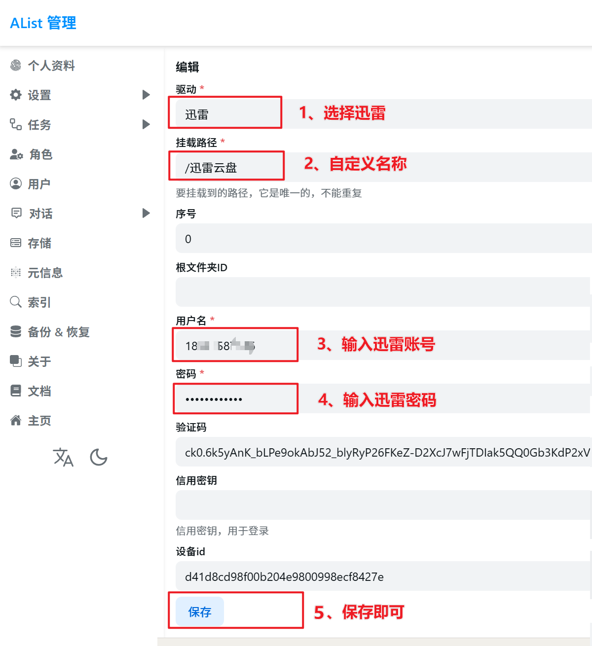 AList存储添加迅雷云盘非常简单,只需要输入账号和密码即可