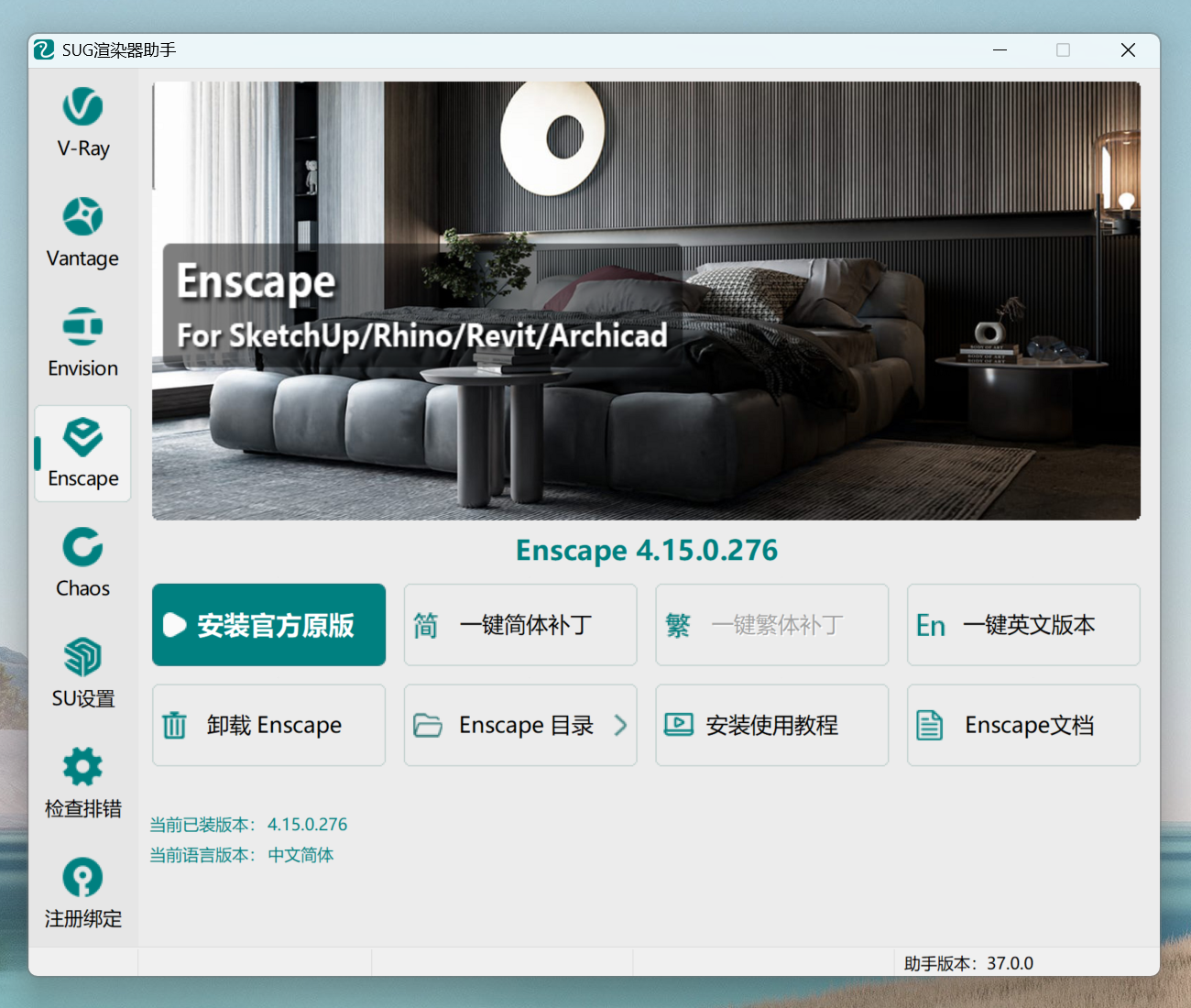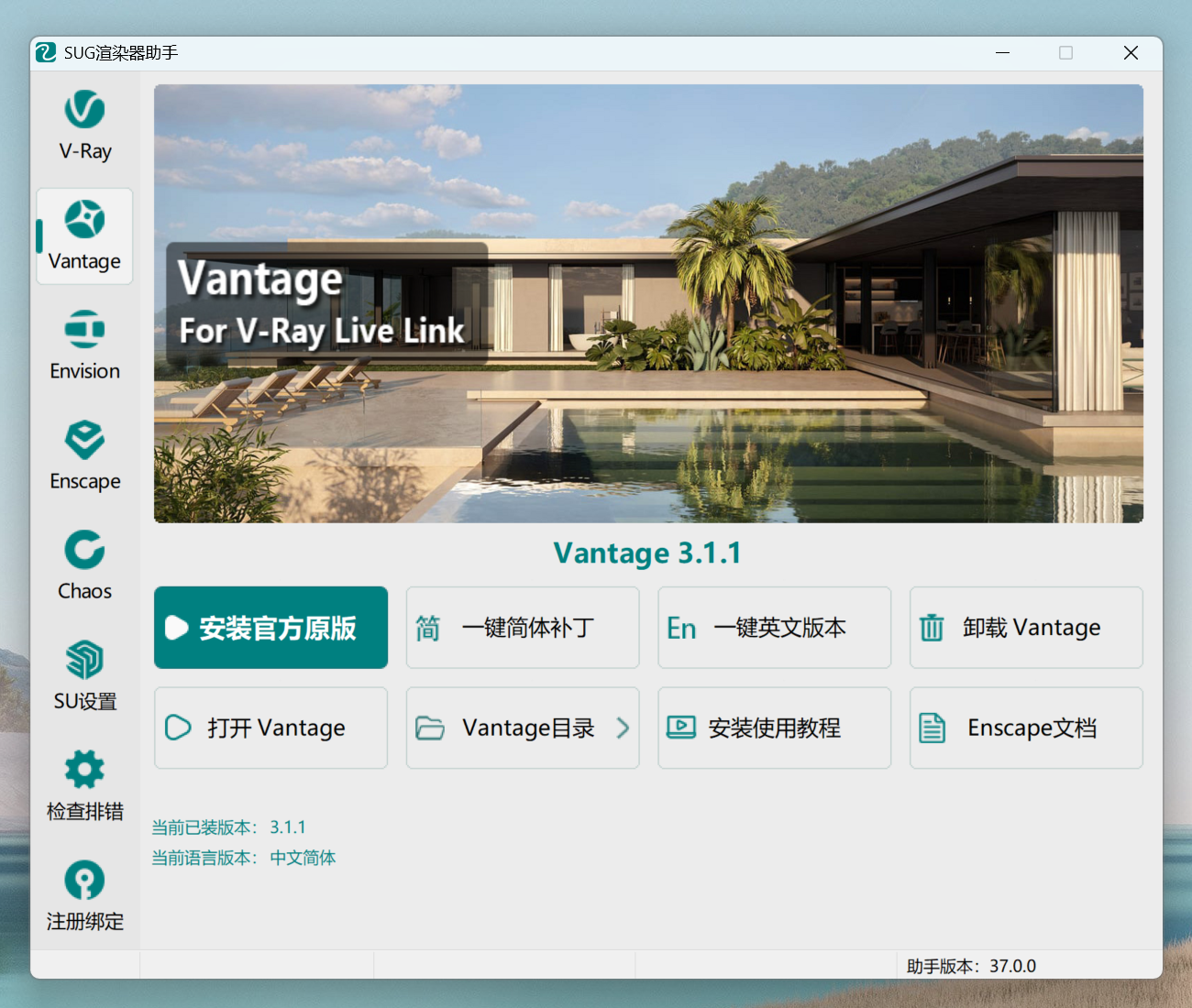 请在SUG渲染器助手左侧栏点击:【Vantage】、【Envision】、【Enscape】分别安装即可。