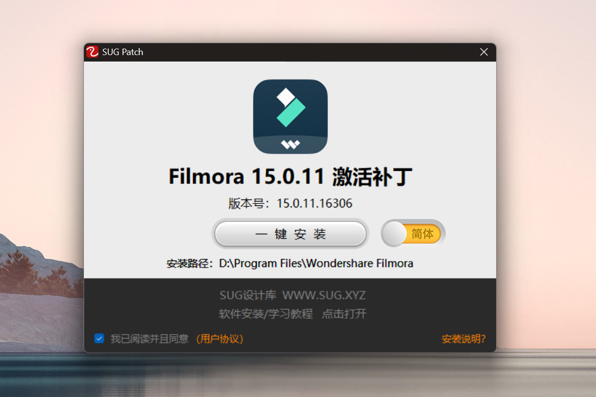关闭Filmora软件,打开SUG助手,点击【一键安装】,还可以切换【简体】中文版