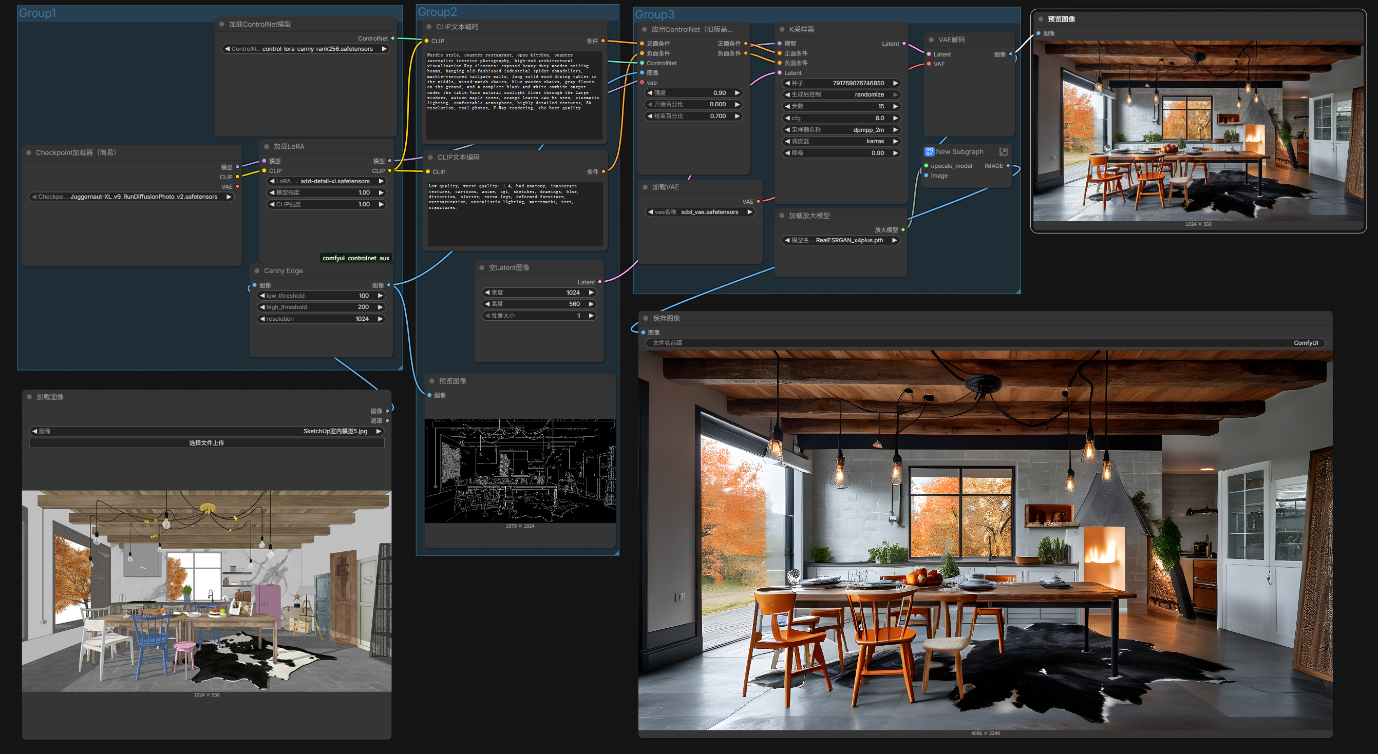 - 与 ControlNet 加载器中的模型control-lora-canny-rank256配合使用,这对组合负责“抠线”与“对齐”。它将 SU 截图转化为黑底白线的“线稿图”,是 AI 理解空间轮廓的地图。ControlNet 模型强制 AI 按照这张图纸填色。