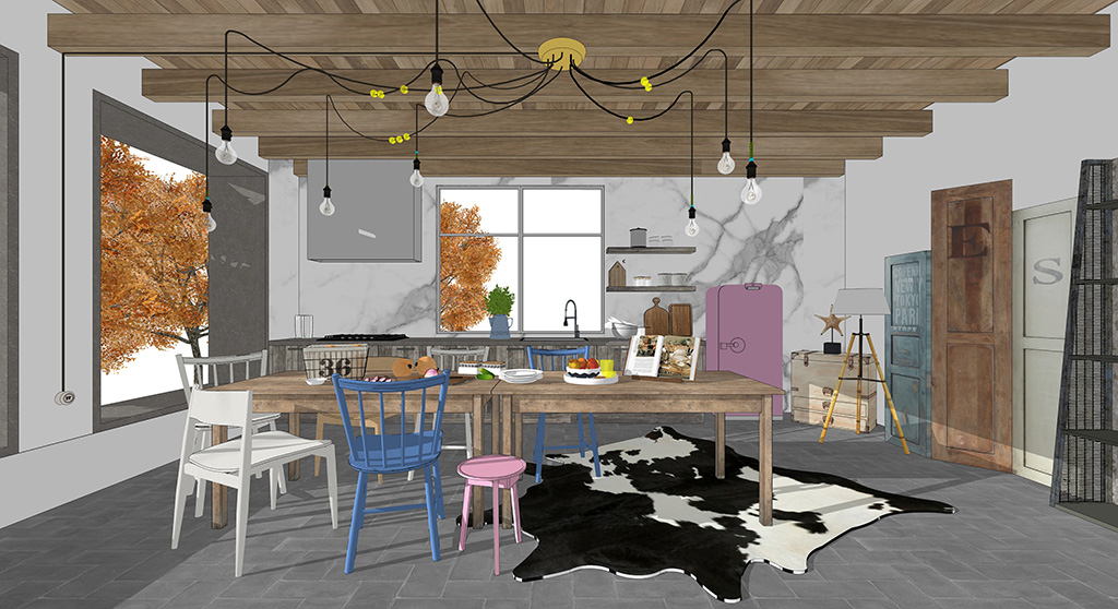 北欧风格,乡村餐厅,开放式厨房,乡村超现实主义室内摄影,高端建筑可视化。关键元素:裸露的重型木质天花板横梁,悬挂的老式工业蜘蛛吊灯,大理石纹理的后挡板墙,中间的长实木餐桌,混合搭配的椅子,蓝色木椅,地面灰色地板,桌子下有一张完整的黑色和白色牛皮地毯。温暖的自然阳光流过大窗户,秋天的枫树,可以看到橙色的叶子,电影照明,舒适的氛围,高度详细的纹理,8k分辨率,真实的照片,V-Ray渲染,最好的质量
