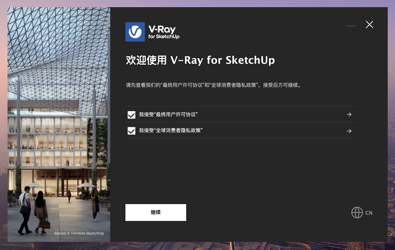 3、安装程序包内的官方原版主程序【vray_720XX_sketchup_mac】。