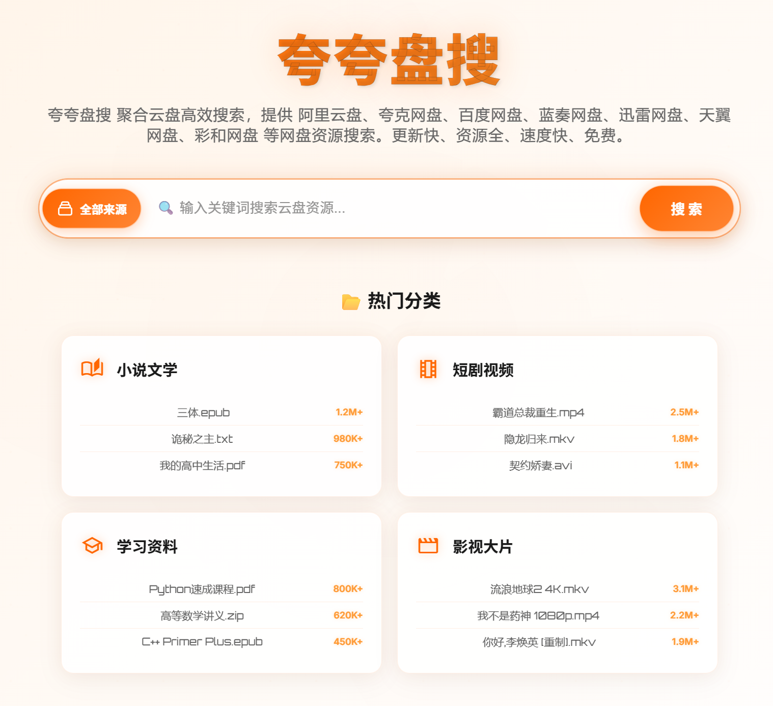 夸夸盘搜 是一款免费无广告、免登录打开即用的聚合网盘资源检索工具,核心功能是整合百度网盘、阿里云盘、夸克网盘、迅雷网盘、天翼云盘等多平台公开分享的资源并自动索引聚合,支持影视、电子书、学习资料、软件等各类资源的高效搜索,不仅资源更新及时、覆盖全面且搜索速度快,还会清晰展示资源名、格式、大小等详情,帮助用户减少无效点击,无需在多个网盘平台间切换即可快速获取所需资源,其核心检索功能免费开放、无付费壁垒,能精准适配日常娱乐、学习办公、资源快速收集等多元需求,为用户提供便捷无门槛的资源查找服务。